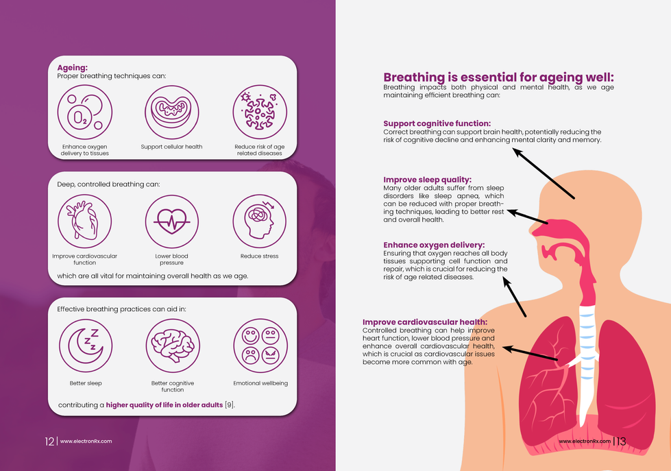 Breathing, 35 page white paper, delving into the importance of breathing. Designed as a sales asset for CES 2025 and HLTH 2025, major conventions in Las Vegas, USA. Design executed as both physical and digital assets.